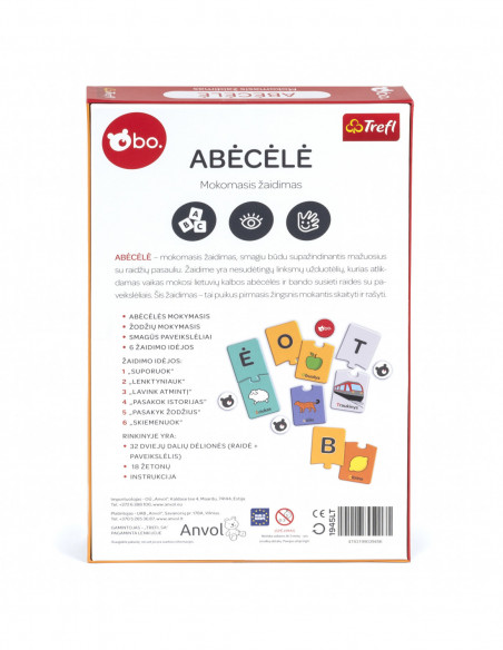 bo. "Tähestik" on hariv pusle, mis tutvustab lapsele lõbusa mängu kaudu tähtede maailma. Mäng sisaldab lihtsaid ja lõbusaid mänge, mille käigus õpib laps leedu keele tähti ja arendab oskust tähti piltidega kokku viia. See mäng on suurepärane esimene samm lugema ja kirjutama õppimisel.