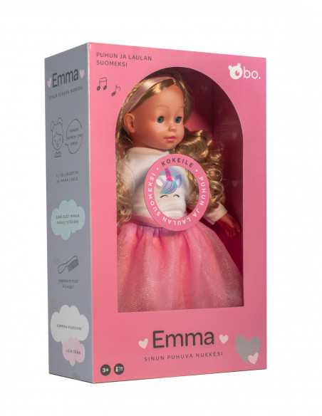 Welcome to the cute world of bo. friends, where cheerful talks and creative plays never end! Look at the Emma talking doll - your new adorable friend soon to be! She has long brushable blond hair for lot´s of hairstyles to create and beautiful sleeping blue eyes. She is dressed with a stylish pink skirt, white shirt with purple unicorn print, little cute pink shoes and look, what a beautiful headband on her curly hair! Doll talks in Finnish language over 20+ phrases and will sing you a song as well. Press her soft belly to hear her lovely talk! Brush and style her hair, cuddle her, play with her, talk to her - it´s all about Emma doll, your new talking friend! Emma talking doll is 40cm tall.