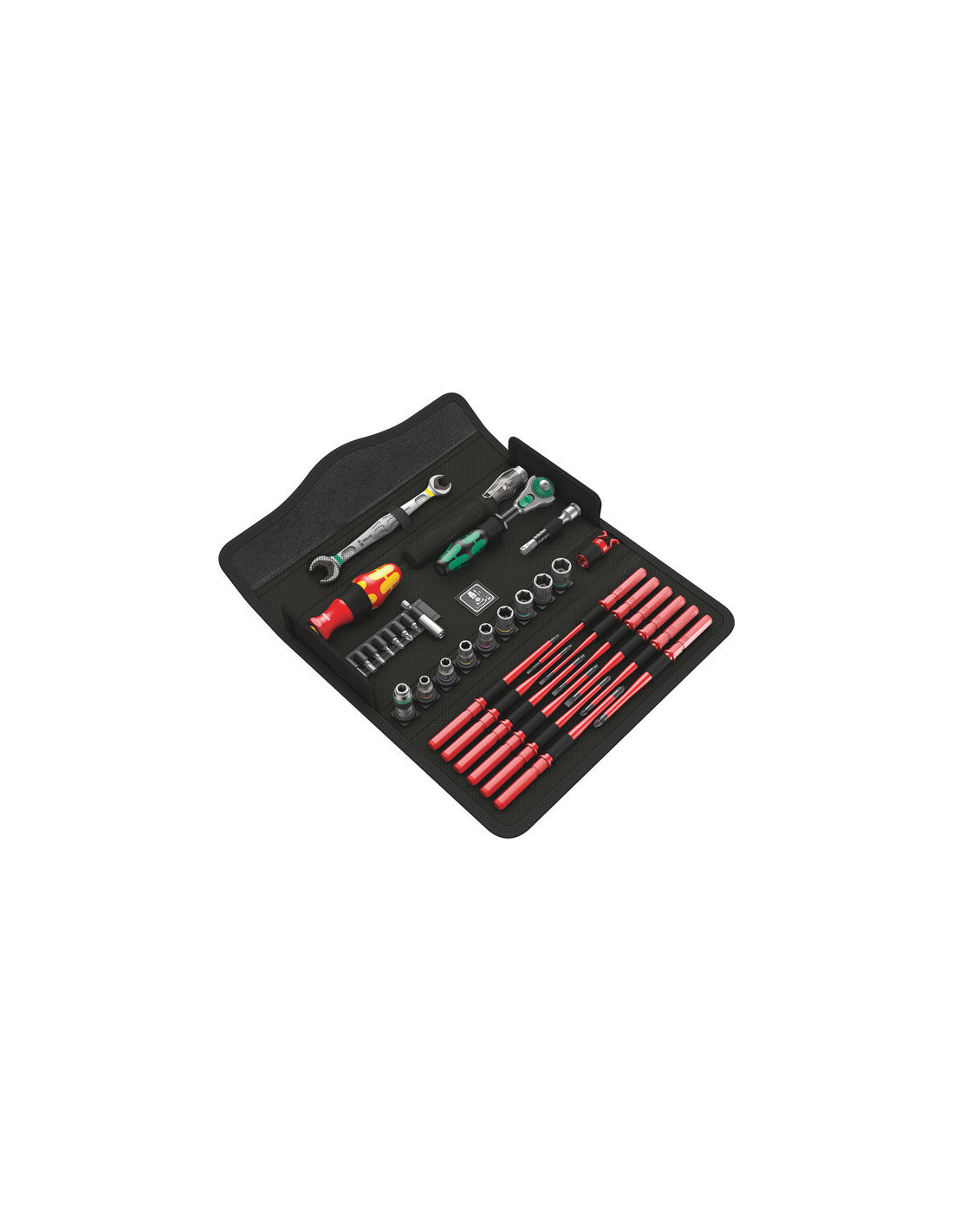 35-osaline Wera Kraftform® Kompakt W1 hoolduskomplekt sisaldab VDE-isoleeritud ja mittesisolatsiooniga kruvikeeramistööriistu nii sise- kui välitöödeks. Komplekti kuulub VDE-sertifitseeritud Kraftform-käepide koos 12 spetsiaalse VDE-otsikuga, Jokeri kahepoolne mutrivõti hoidefunktsiooni ja sügavuspiiranguga, Zyklop Speed ¼″ peenehamba ratchet lisatarvikutega, kaheksa padrunit mõõtudes 5,5–13 mm, universaalne otsikuhoidja, seitse 25 mm pikkust kruvikeerajaotsikut, kruvihoidik täpseks eelpaigutamiseks ning ühefaasiline 247 pingetester. Kõik tööriistad on paigutatud vastupidavasse vertikaalsesse tekstiilkotti, mis võimaldab mugavat hoiustamist ja transporti.