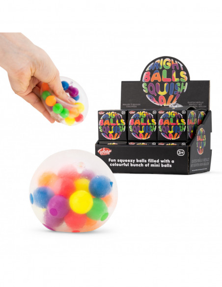 Soft and squidgy ball filled with a few dozen colourful balls. It´s a squishy toy that provides an interesting tactile experience when squeezed, largely thanks to the eye-catching filling that moves and shifts around inside this transparent ball. It can be squished and squeezed over and over, but always snaps back to its original shape as soon as you put it down. It also makes a fantastic alternative to a classic stress ball.