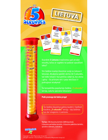It should be a piece of cake to name 3 Lithuanian football players - but can you do it under time pressure? All questions concern Lithuania and Lithuanians. You have 5 seconds, so you say whatever comes to your tongue. Funny and sometimes bizarre answers are given, and the balls fly down the spiral of a special timer. A compact version of the best-selling game 5 seconds set in Lithuanian realities! You can also use the question from this version of the game in the classic 5 seconds game. They will diversify your fun. Perfect for any occasion!