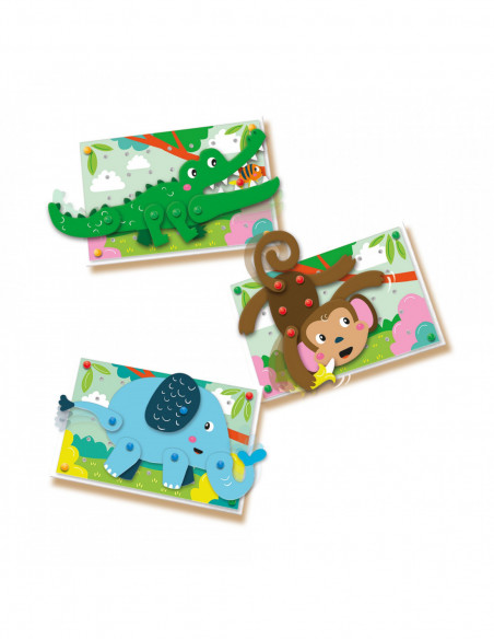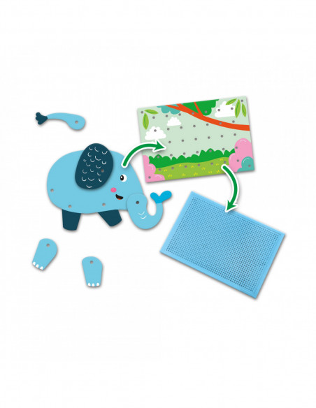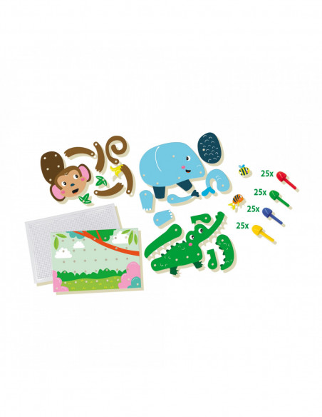 Mosaiik ja puzzle ühes! Leia lehtedele õige džunglilooma pilt ning kinnita selle osad nööpnõeltega. Tee elevant, ahv või krokodill ja pane loomad liikuma, kui oled valmis!