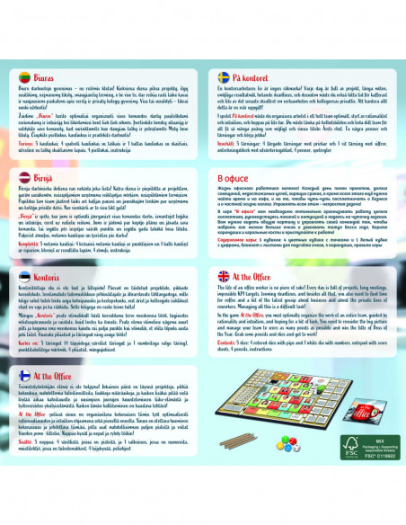 Lauamäng „Kontoris“. Kontoritöötaja elu ei ole lust ja lillepidu! Päevad on täidetud projektide, pikkade koosolekute, teostamatute tulemuslikkuse põhinäitajate ja ähvardavate tähtaegadega, mille kõige vahel tuleb leida aega kohvipausiks ja keelepeksuks, sest ärist ja kolleegide isiklikust elust on vaja ju ka rääkida. Selle kõigega on raske toime tulla! Mängus „Kontoris“ peate võimalikult hästi korraldama terve meeskonna tööd, tuginedes mõistuspärasusele ja vaistule, kuid lootes ka õnnele. Peate olema võimeline nägema suurt pilti ja koguma oma meeskonna kaudu nii palju punkte kui võimalik, et võita lõpuks aasta juhi tiitel. Haarake pliiatsid ja täringud ning asuge tööle!