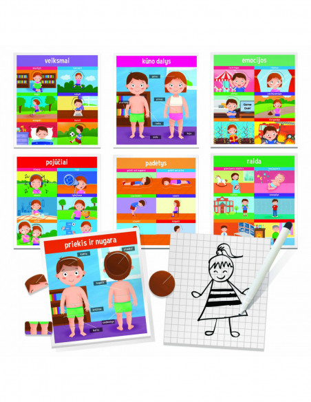 The contents of this game help children to recognize parts of the body, build a body map and represent the body at ease and in motion. Looking at the pictures and playing with the cut-out shapes, children also become aware of their own bodies which, from birth, have been a means of learning about themselves in the world. With the guidance of a parent (or educator) the contents of the box can be used to organise both teaching activities and also “movement” and psychomotor games in dedicated spaces or in the open air, developing their autonomy and emotional confidence.