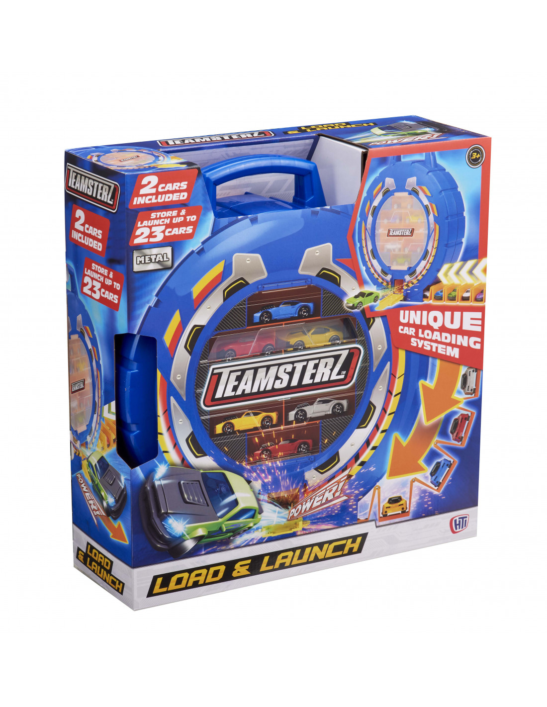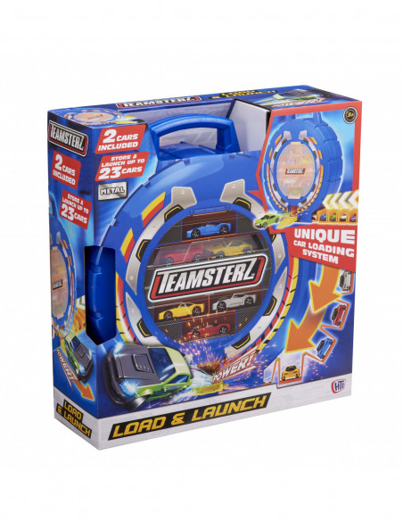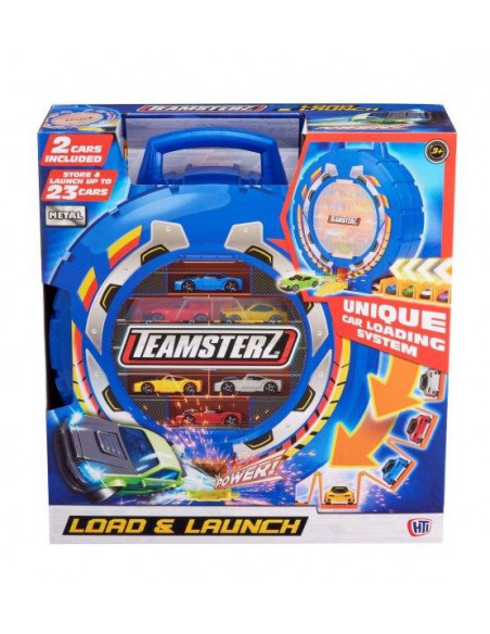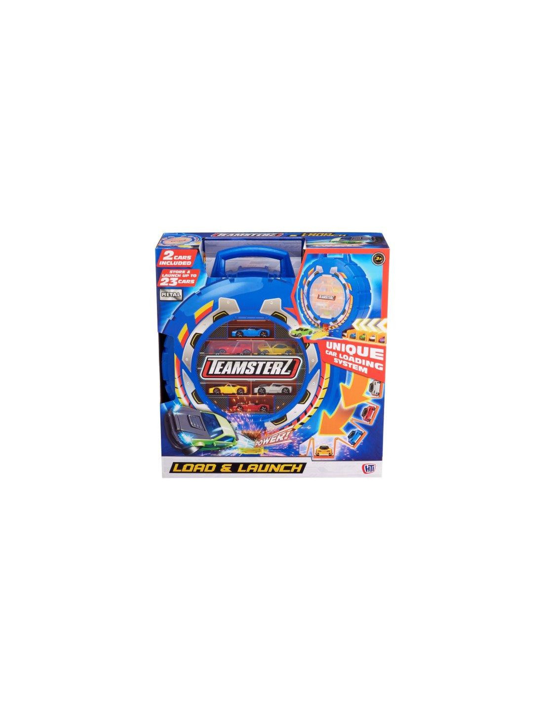 Transport your cars with a twist with the Teamsterz Load & Launch with 2 cars! This wheel shaped carry case which holds up to 23 cars, also doubles as a car launcher! Turn the cog to reveal the unique car loading magazine, load up to 15 cars, pull down the door and press the launch button and shoot out all the cars in rapid-fire succession. The Load & Launch is also compatible with extruded track for broader play, as well as a carry handle for portable play. The perfect gift for any enthusiastic little driver, offering hours of imaginative fun! The Teamsterz die-cast vehicles included are approximately 7,5 cm scale and feature a high quality die-cast body shell and independent free moving wheels.