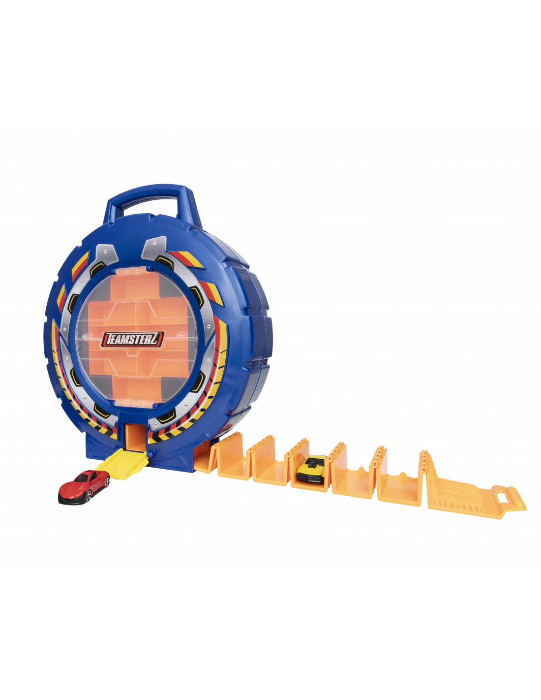 Teamsterz on rahvusvaheliselt tunnustatud kaubamärk, mis on inspireeritud tõsielusõidukite disainist ja omadustest, julgustades kollektsioneerimist ja hindama atraktiivsust. Transpordige oma autosid geniaalselt ja stiilselt uue Teamsterzi komplektiga! See on samaaegselt nii pilkupüüdev ning praktiline hoiustamine kui ka autoheitja! Rattakujuline korpus mahutab kuni 23 Teamsterzi autot. Keerake hammasratast, et paljastada ainulaadne auto laadimisala, laadige korraga kuni 15 autot, tõmmake uks alla ja vajutage käivitusnuppu ning tulistage kõik autod üksteise järel kiiresti välja! Komplektis on kaks ca 7,5 cm suurust Teamsterzi metallist sõidukit. Ideaalne kingiidee, mis pakub tundideks loomingulist lõbu kõigile väikestele ja entusiastlikele autohuvilistele! Komplekt aitab teil arendada lapse sotsiaalseid oskusi, kujutlusvõimet ja peenmotoorikat.