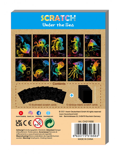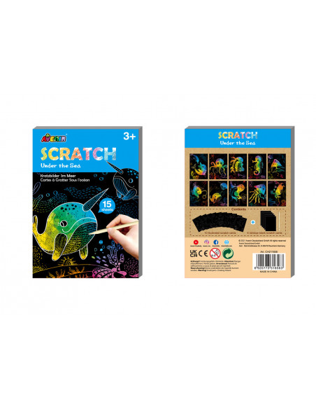 Aveniri erksavärvilised kraapimiskaardid hoiavad lapsed tegevuses ja pakuvad neile värvikaid elamusi, lisaks arendavad need loovust ning kujutlusvõimet. Merealuse maailma avastamiseks on nüüd uus äge kraapimiskunsti komplekt (15 kaunist lehte), mis paneb teie lapse tundma end tõelise kunstnikuna! Kraabi lehti komplektis oleva spetsiaalse pliiatsiga ning loo ägedaid värvilisi pilte. Iga tõmme spetsiaalse pliitasiga eemaldab musta kattekihti ning paljastuvad peened kujundid, millele tekstuuri, mustreid ja kujutlusvõimet lisades vormuvad enneolematud ja eriilmelised pildid.