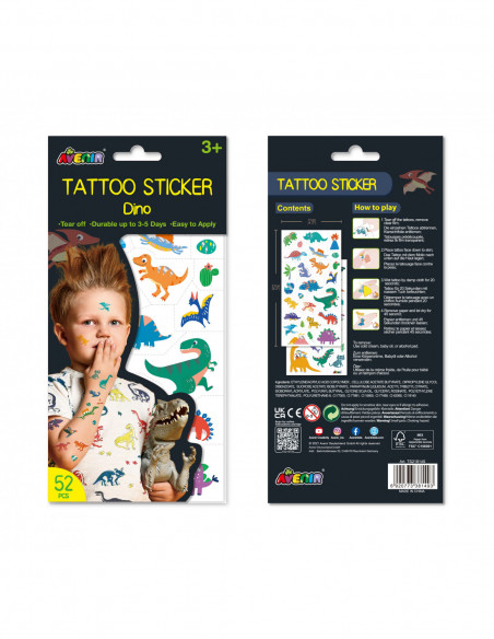 Tattoo-kleepsud „Dinosaurus“. 1) Võtke tätoveeringud ja eemaldage läbipaistev kile. 2) Asetage tätoveering nahale nii, et pealispind jääb allapoole. 3) Niisutage tätoveeringut kergelt märja lapiga 20 sekundit. 4) Eemaldage ettevaatlikult paber ja laske 45 sekundit kuivada.