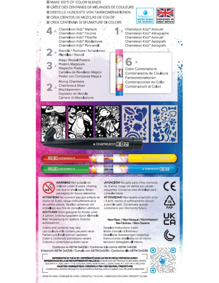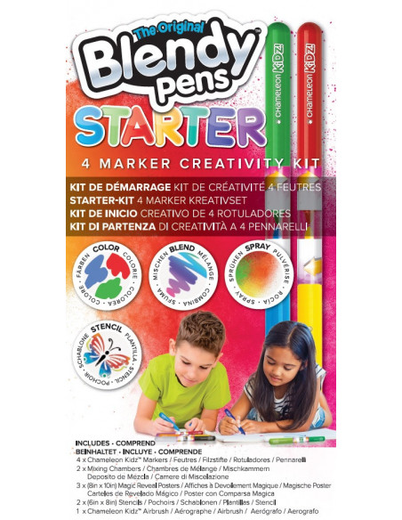 4 Chameleon Kidz Blendy Pens, 2 Mixing Chambers, 3 Chameleon Magic Reveal Posters, 2 Chameleon Stencils, 1 Chameleon Kidz Airbrush, 1 Instruction Booklet