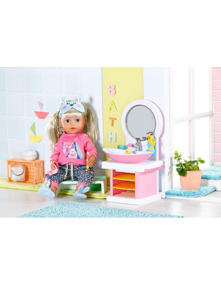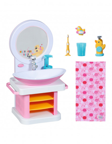 Tere tulemast BABY BORN nukumaailma! See on kujutlusvõimeline rollimäng värvikas mängumaailmas! Baby Borniga mängimine ei muutu kunagi igavaks! Üks päev on ta beebi, kelle eest on vaja hoolitseda, teine päev on ta sõber ja kaaslane toredateks seiklusteks. Baby Born armastab väga oma hügeeni eest hoolt kanda. Selleks, et hommikul ennast teguderohkeks päevaks valmis panna, läheb ta oma vannituppa, et pesta käsi ja hambaid. Kraanikausi juurde jõudes lülitab Baby Born sisse oma kraanikausi peal oleva peeglitule, et ka hämaras ennast peeglist näha. Peegli äär süttib ja vajutades peegli all roosat nuppu, kostub ka ilus meloodia. Nüüd tuleb hakata käsi pesema. Kaua seda tegema peaks? Selleks, et peseksid piisavalt kaua käsi vajuta seebidosaatorile –meloodia kõlab just nii kaua, kui kaua tuleb käsi pesta. Pärast kätepesu tuleb pesta ka hambad. Baby Bornil on vahva hambaharja tops, millest kostub heli hambaharja sellest välja võttes. Rollimängud arendavad laste kujutlusvõimet ja empaatiat. Mõõdud 18 x 25.8 x 39.8 cm.