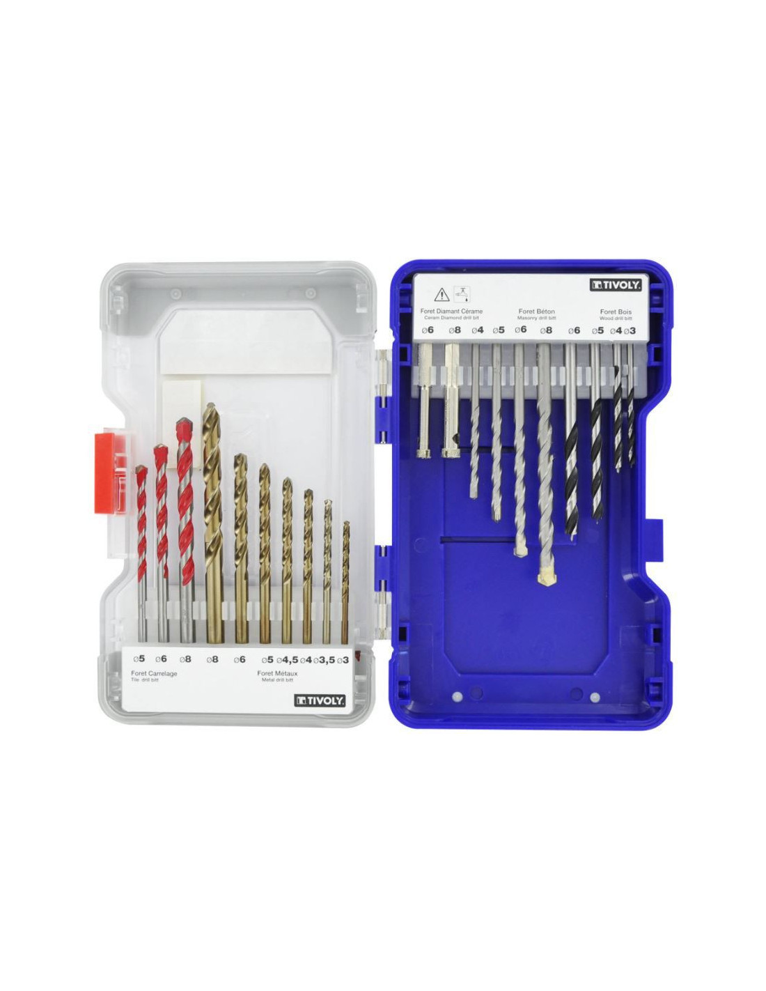 See 20-osaline Tivoly segamaterjalide puurikomplekt on mõeldud “eripuurimiseks” keraamika, terase, betooni, plaatide, keraamilise kivinõude, puidu ja plastide peal. Komplekt sisaldab 7 kuldset "split point" HSS-puuri (Ø 3, 3.5, 4, 4.5, 5, 6, 8 mm), 4 karbiidinsertiga betoonpuuri (Ø 4, 5, 6, 8 mm), 3 spetsiaalse lihvitud karbiidplaatpuuri (Ø 5, 6, 8 mm), 2 teemantkattega keraamilist kivinõupuur i (Ø 6, 8 mm) ja 4 kolmiktipuga puidupuuri (Ø 3, 4, 5, 6 mm). Kõik tööriistad on paigutatud T20 Mixed RANGER karpi, millel on põrutuskindel kaitse ja ergonoomiline hoidik organiseeritud hoiustamiseks ja lihtsaks transportimiseks.