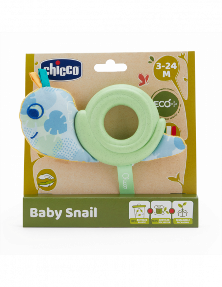 First plush toy, perfect for babies, in recycled materials. They help develop hand coordination skills. The snail shell is made of recycled plastic and has a nice texture, as do the different fabrics, to stimulate babies´ tactile sensitivity. The outer textile materials contain 100% recycled polyester, while the plastic elements contain 80% recycled plastic, with recyclable packaging. It is part of Chicco ECO+. ECO+ toys have exactly the same high quality standards as any other Chicco product, both in terms of playability and product safety.