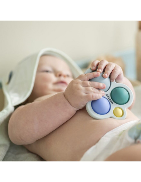 Pop-it närimistusrõngas, valmistatud BPA-vabast pehmest silikoonist, pakub teie beebile palju mängurõõmu! See on mõeldud väikestele kätele, ergutab last mulli vajutama ja soodustab peenmotoorika oskusi. Plõksuv heli ja erineva tekstuuriga pinnad kutsuvad teie beebit mullikesi vajutama. Lisaks saab Pop-it´i kasutada ka närimisrõngana, leevendades hammaste tuleku valu.