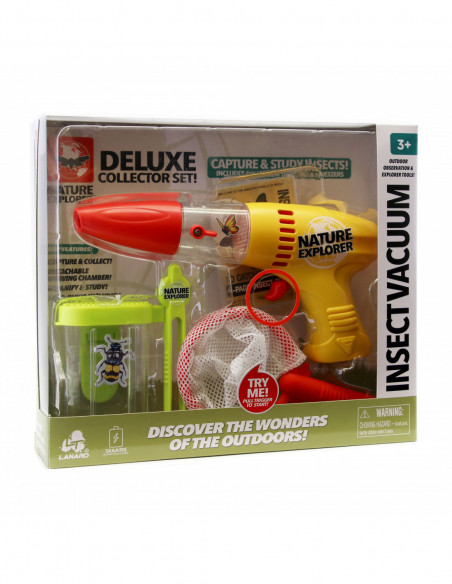 Discover the wonders of the outdoors with the nature explorer deluxe collector set! Easily suck up small bugs & critters with additional collection tools & storage tank. Vacuum includes detachable viewing chamber to view, magnify and study all of your awesome outdoor findings!  2-in-1 critter vacuum comes with a detachable magnifying chamber.