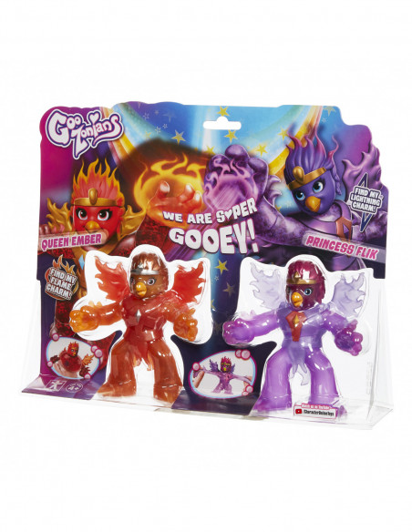 Introducing GooZonians - the stretch-iest ever superheroes protecting the magical realm of GooZonia - a land where enchanted rainbow-hued goo flows through everything! Get ready for some magical adventures with a range of new super squishy, super stretchy heroes like no other! Meet Queen Ember, Princess Flik and friends as they juggle strange new powers, royal responsibilities, and squad goals while preventing the ApoGoolypse! This special twin pack of GooZonian action figures includes exclusive versions of Queen Ember and Princess Flik with never seen before fillings. Stretch and squish your GooZonian Hero and they will always come back to their original shape!