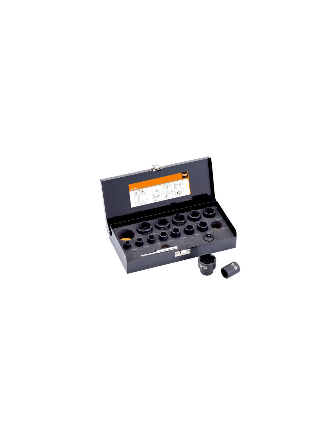 • 14 saadaolevat mõõtu. 3/8" ajam: 8, 10, 11, 12, 13, 14, 16, 17, 18 ja 19 mm. 1/2" ajam: 21, 22, 24 ja 27 mm