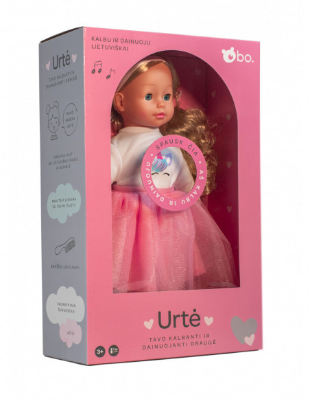 Welcome to the cute world of bo. friends, where cheerful talks and creative plays never end! Look at the Urte talking doll - your new adorable friend soon to be! She has long brushable blond hair for lot´s of hairstyles to create and beautiful sleeping blue eyes. She is dressed with a stylish pink skirt, white shirt with purple unicorn print, little cute pink shoes and look, what a beautiful headband on her curly hair! Doll talks in lithuanian language over 20+ phrases and will sing you a song as well. Press her soft belly to hear her lovely talk! Brush and style her hair, cuddle her, play with her, talk to her - it´s all about Urte doll, your new talking friend! Urte talking doll is 40cm tall.