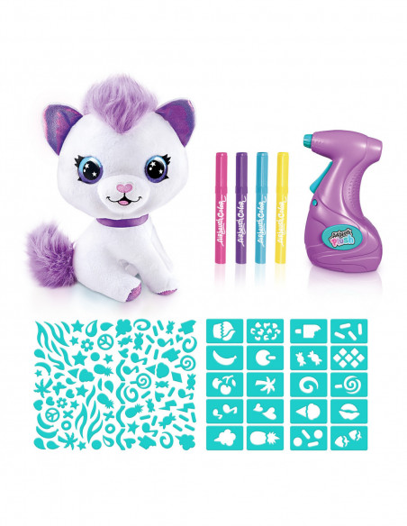 Anna oma maagilisele kiisule ikka ja jälle stiilimuutus! Loo oma armas kassike akutoitel töötava õhupintsli ja 4 värvilise markeri abil vapustav stiilimuutus, mis avaldab muljet nii sulle, kui su sõpradele. Kasuta oma väikese sõbra kujundamiseks ja kaunistamiseks kaasasolevaid 100+ kleepuvat šablooni ning kui oled valmis muutusteks, pese kiisuke lihtsalt veega puhtaks ja alusta uuesti!