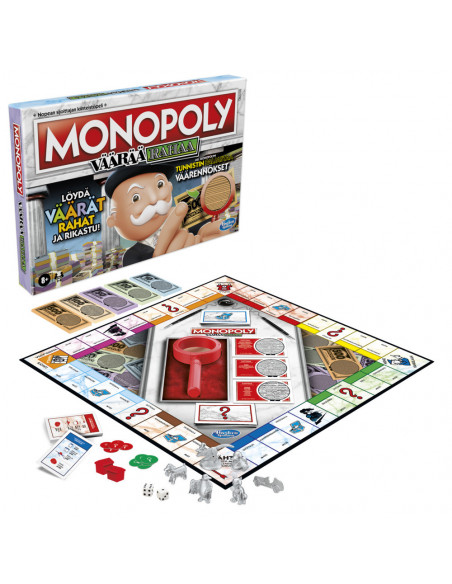 Monopoly - the fast dealing property trading game! Monopoly - the fast dealing property trading game! In the Monopoly Crooked Cash game things aren´t always as they seem. Someone added fake cash and fake Chance cards! Luckily, Mr. Monopoly is giving players his decoder so they can find the fakes and still make a fortune. It´s an exciting game of hidden reveals, and players get to challenge their opponents for using fakes with accusation coins. But use them wisely! You only get a few coins to play. Includes Monopoly tokens that play up the deceptive theme. The player with the most money at the end - real or fake - wins. This family board game is a fun game to play. The game is in Finnish language.