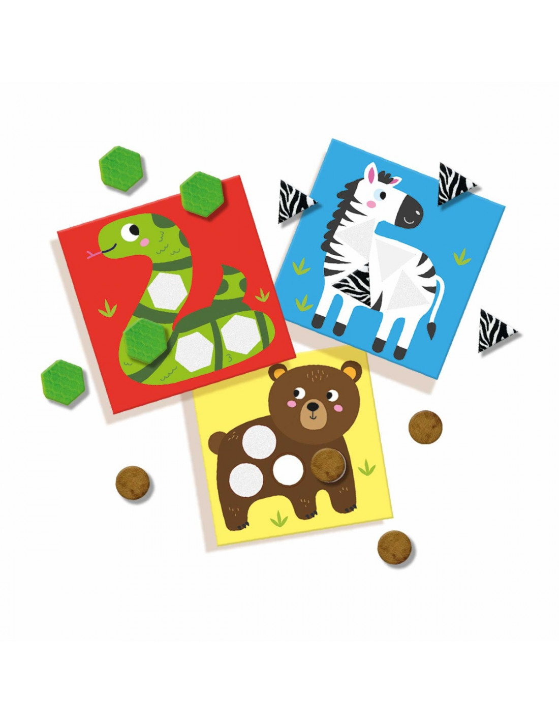 Oih, neil kuuel loomal puudub osa karvastikust. Kas annad neile tagasi nende kehakatted ja asetad eri tüüpi karusnahaga kujundid õigesse kohta? Kas karul on pehme või kare karv? Saa teada! Eemalda mosaiigikujundite pealiskiht, siis on neid lihtne kaartidele kleepida.