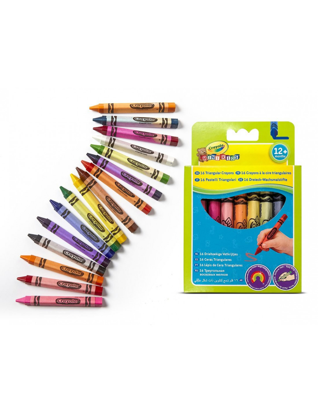 16 värvi rasvakriite. Kolmnurkse kujuga, et väikesel kunstnikul oleks mõnus käes hoida.