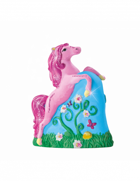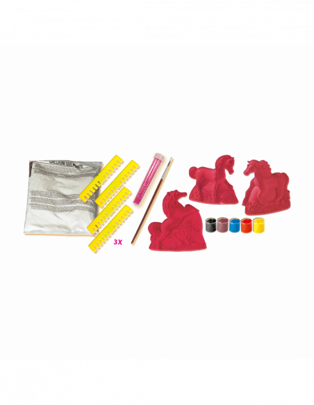 Your own horse models made of plaster! Pour the plaster into the different 3D moulds: a foal, a standing horse and a rearing horse. Let the models dry and paint your horses with the paint included in the set.