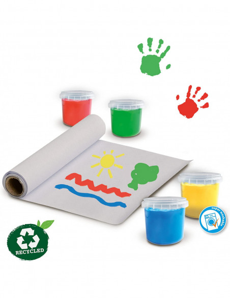 This ECO finger paint set contains different colours of finger paint, an activity apron and a roll of recycled paper that you can use to create beautiful works of art. Choose a fun colour and use your fingers to draw. You don´t need to worry about getting your clothes dirty because the ECO apron in the set will protect you against stains. The apron is made of 100% recycled PET bottles and is specially designed for our ECO line. The ECO line contains a higher percentage of natural raw materials and uses recycled materials.