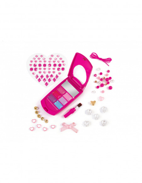 1 mirrored flip phone palette, 7 strawberry-scented solid lip gloss colours, 1 lip gloss applicator, 1 polyester cord 50 cm, 41 assorted beads, 1 sheet of adhesive gems, 1 instruction sheet
