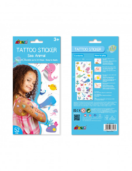 Tattoo-kleepsud „Mereloomad“. 1) Võtke tätoveeringud ja eemaldage läbipaistev kile. 2) Asetage tätoveering nahale nii, et pealispind jääb allapoole. 3) Niisutage tätoveeringut kergelt märja lapiga 20 sekundit. 4) Eemaldage ettevaatlikult paber ja laske 45 sekundit kuivada.