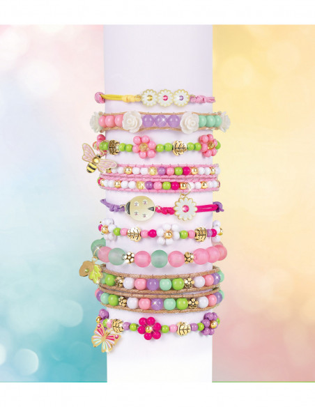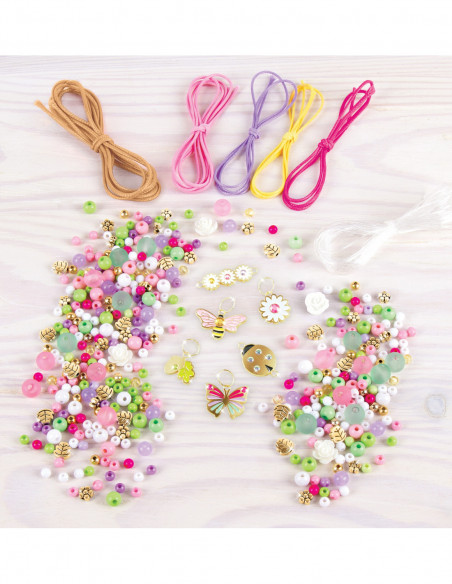 5 colors of waxed cord (4.5m), clear elastic cord 6 m, 447 assorted beads, 6 charms embellished with Swarovski® crystals, bead tray, instructions.