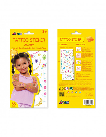 Tattoo-kleepsud „Ehted“. 1) Võtke tätoveeringud ja eemaldage läbipaistev kile. 2) Asetage tätoveering nahale nii, et pealispind jääb allapoole. 3) Niisutage tätoveeringut kergelt märja lapiga 20 sekundit. 4) Eemaldage ettevaatlikult paber ja laske 45 sekundit kuivada.