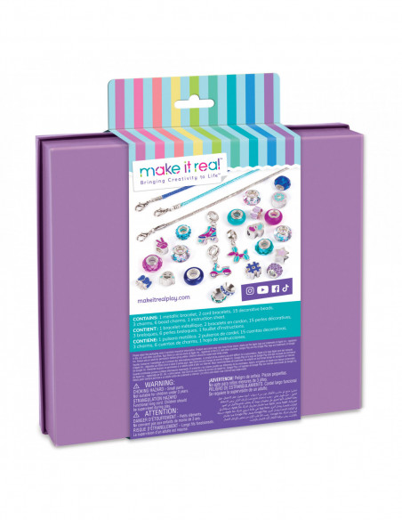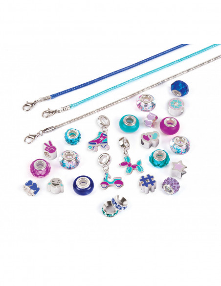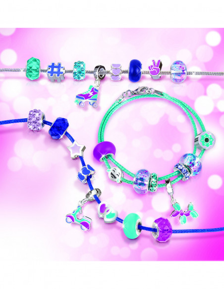 Metallic bracelet, 2 cord bracelets, 15 decorative beads, 3 charms, 6 bead charms, instructions.